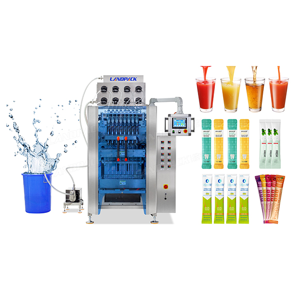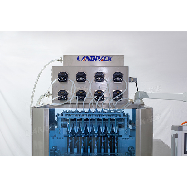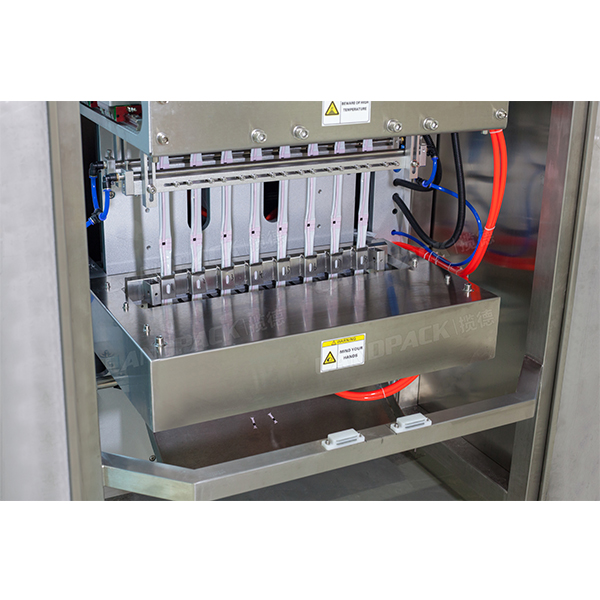 整機采用8頭通道 、卷膜、制袋、封切、封口一體機設備。適用產品主要為液體類,如簌口水、速溶飲料、蜂蜜、果汁、果凍、辣椒油等不同液體狀態(tài)的產品。