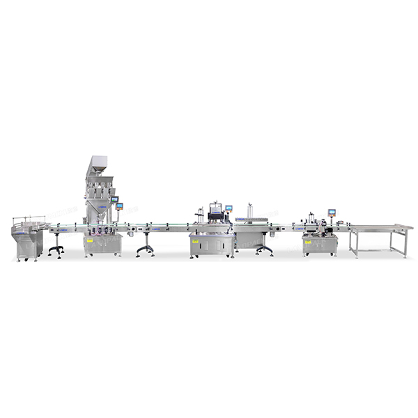 2.本線采用自動送瓶、線性秤灌裝機、四輪旋蓋機、對夾式定位圓瓶貼標機、收集平臺組成全自動化生產線;