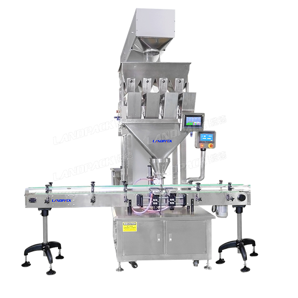 理瓶-線性秤灌裝機-人工上蓋-四輪旋蓋-鋁箔封口-貼標-收集平臺