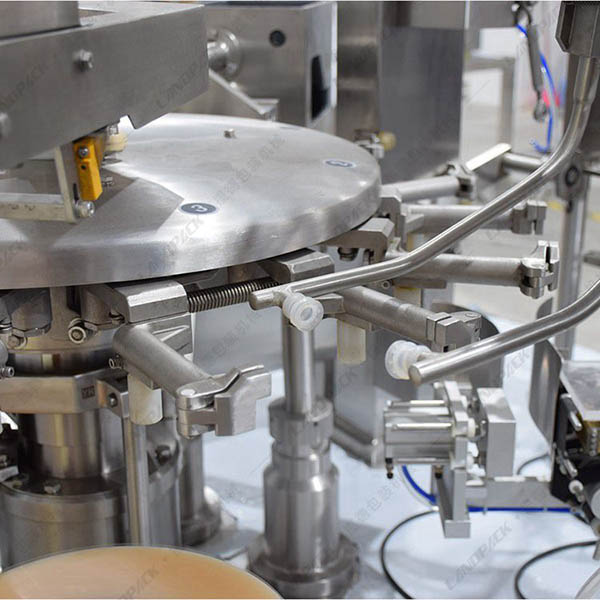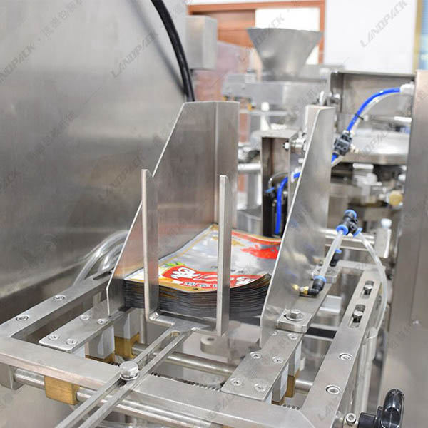 工作流程: 上袋→打印生產日期→開袋→充填1→充填2→空位→熱封→整形及輸出