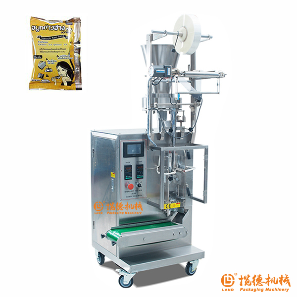 該款機器適合干燥劑、砂糖、奶精、醫藥、雞精、鹽、洗衣粉、種子、調味料、胡椒細小等顆粒物料的自動包裝。包裝袋子的類型一般為三邊封口,如果需要其它四邊封口或者背封口的話,只需要更換封口裝置和制袋器即可,若有多個規格,如袋子寬度有幾個尺寸,則使用多個制袋器進行更換包裝。