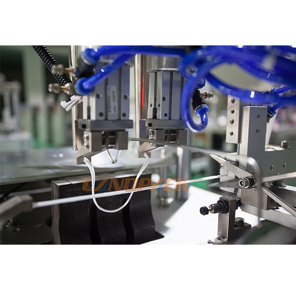 這臺機器比起那種小型焊接機效率比較高,不需要人工提前把耳線進行修剪。機器自動完成耳帶的切斷,我們只需要把耳線掛到機器即可。